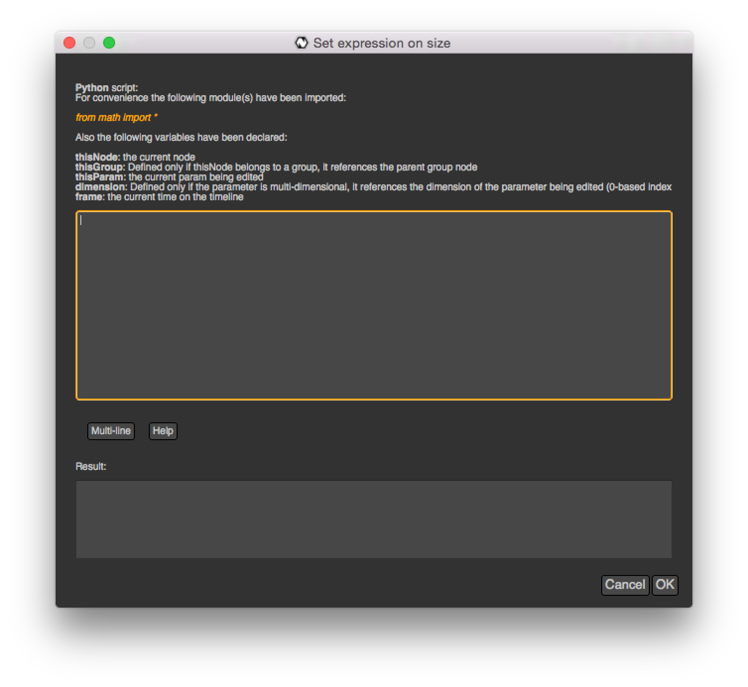 However if you were to write an expression that spans over multiple lines you would need to specifically set the ret variable yourself and toggle-on the multi-line button:
