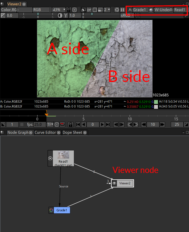 Above: a viewer can have multiple inputs, up to 10. By default only one input is displayed. Once you choose a mixing mode (see red box above) A and B sides become active. “W_under” is the usual mode.