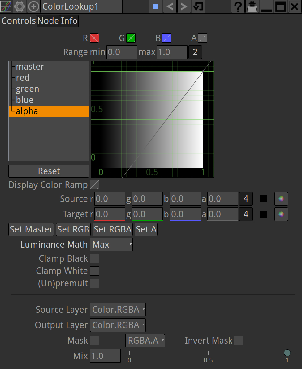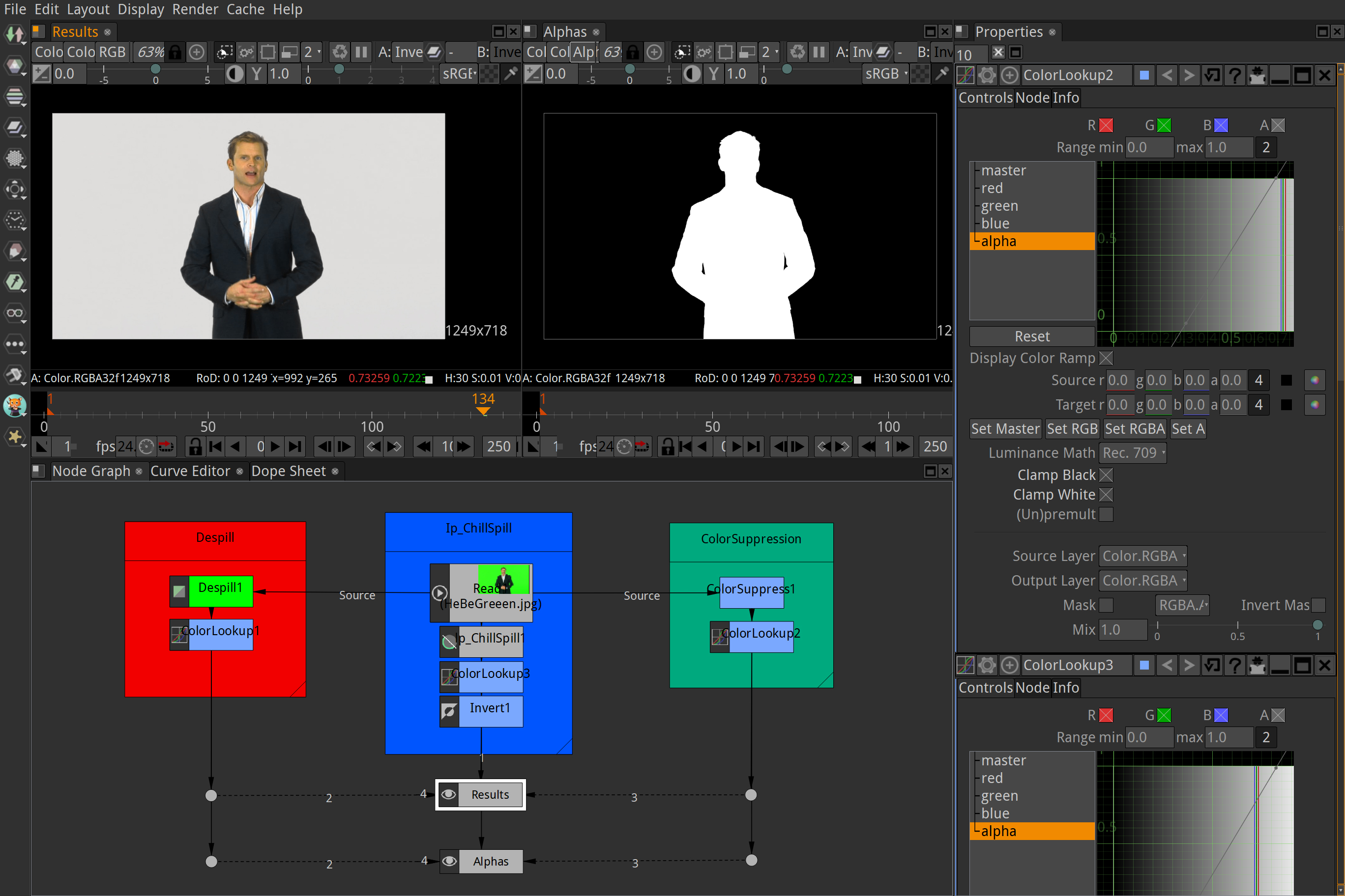Here are the nodes and their settings to show what I had to do to get it to scale my suppression mattes. The key tool is to use the ColorLookup Node connected after the despilling nodes. The ColorLookup Node four color channels and the channel that you use the scale your mattes is the “alpha curve channel”. The bottom left of the alpha curve is used the to crush your blacks/shadows and the top right is used to extend your white/highlights. In the ColorLookup Node you will also see a feature called “Luminance Math”. This feature will yield its full benefits based off the resolution and color spaces of your footage. The ColorLookup node is very powerful in a sense because the channel curves can have multiple points to limit its effects.
