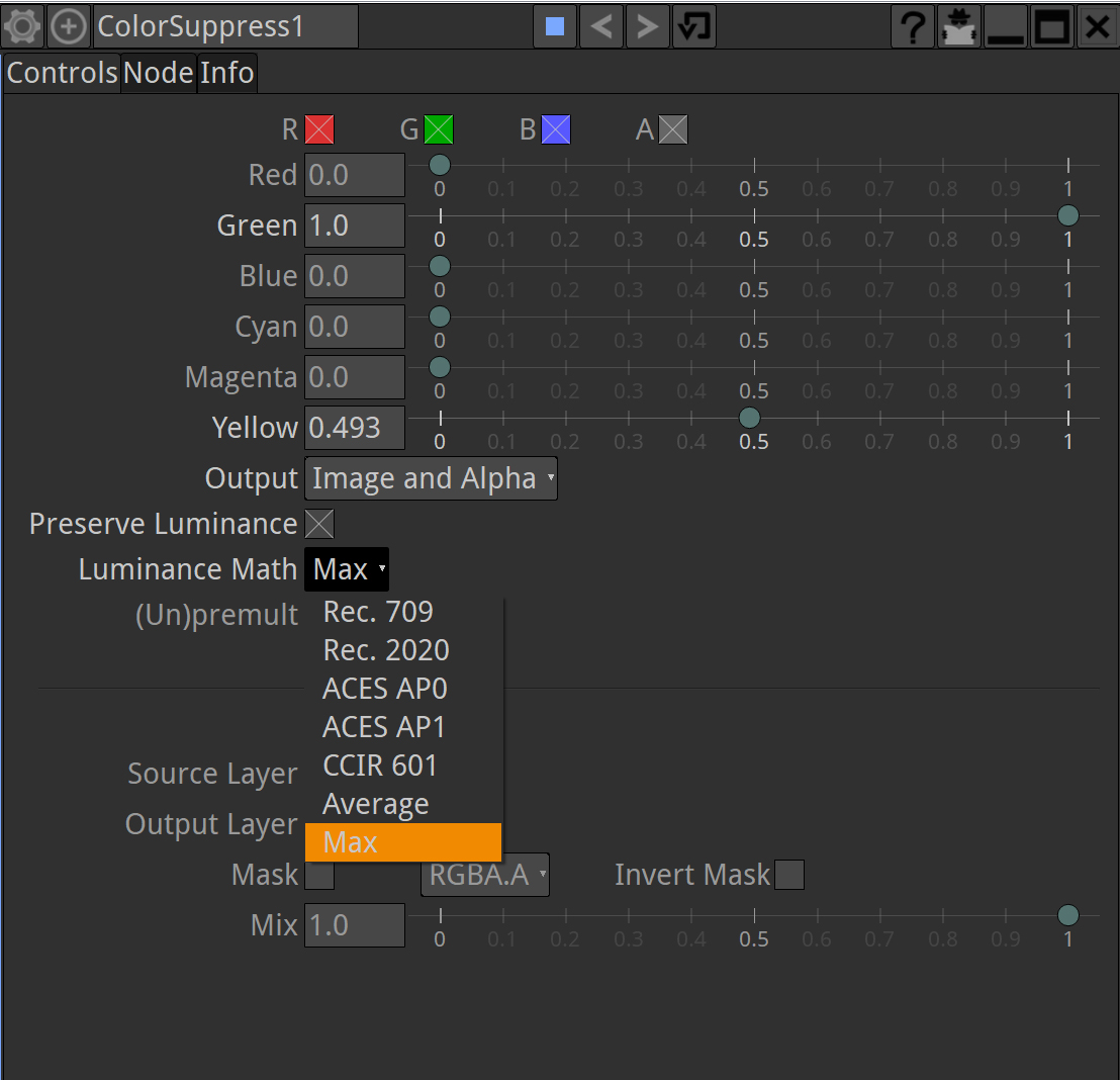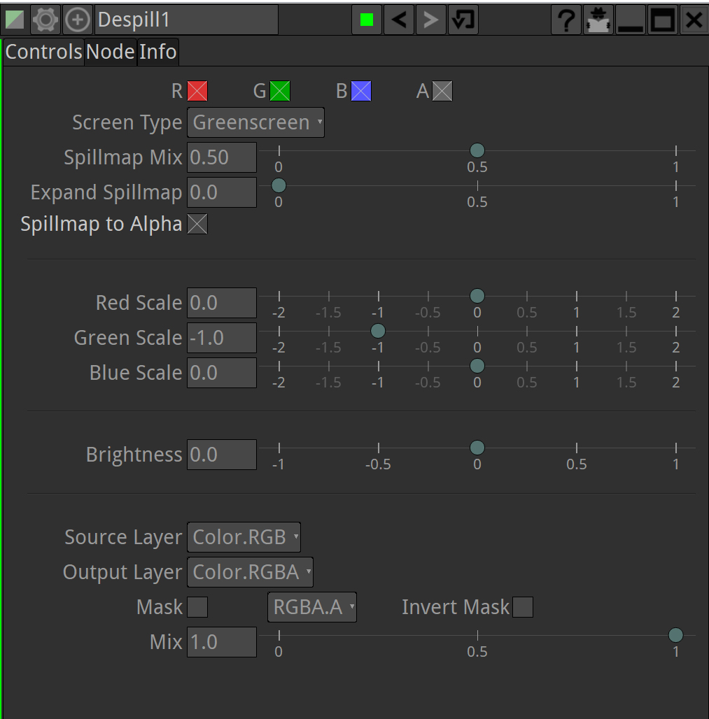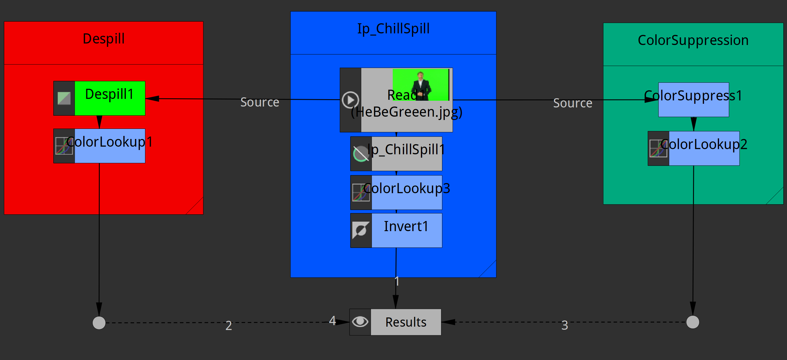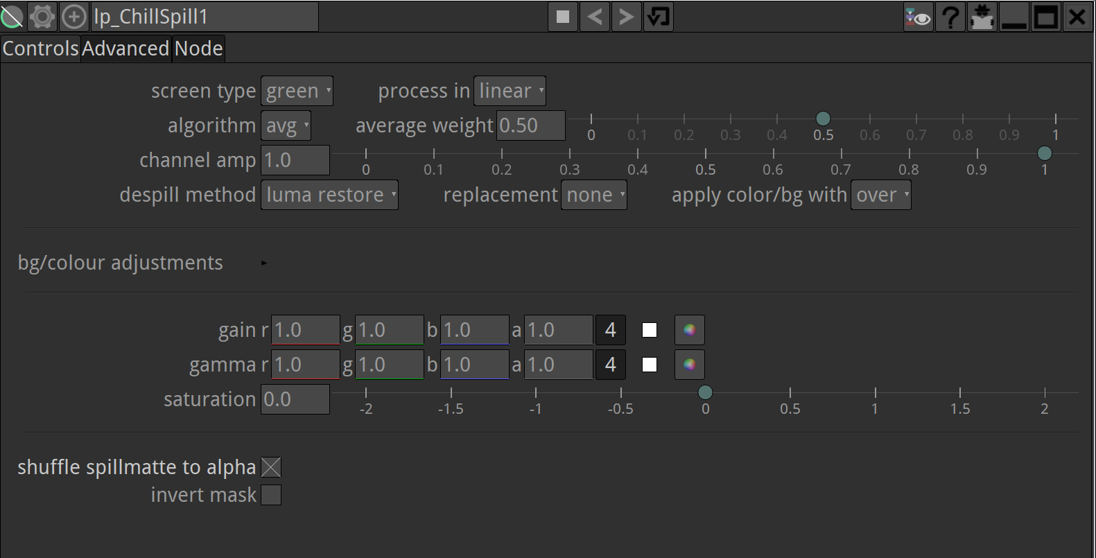 The added functionality is having the ability to use the suppressed or despill color information and convert it to a matte or alpha. I am unaware if any other compositing applications has these abilities. Natron is my main compositing app and from time to time I use these despilling node algorithms to help generate masks, general mattes and scaled alphas. This is Natron’s node graph pipeline for each node that I will be discussing. The pipeline for each node is really simple. You just connect the green/blue screen footage to the input of the nodes, adjust whatever you have to adjust, click on the very simple knob that says “Spillmap to Alpha” if you are using the Despill node, “Shuffle Spillmatte to Alpha” if you are using the community openfx plugin called Ip_ChillSpill Node, and “Output: Image, Alpha & Image and Alpha” if you are using the ColorSuppression node.